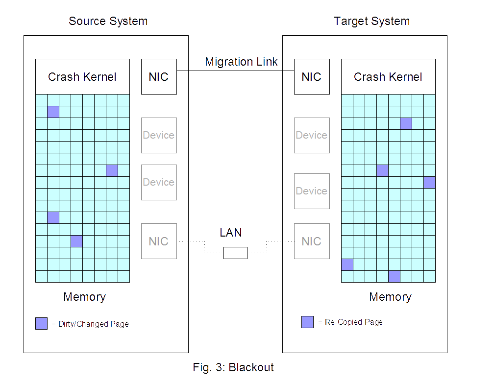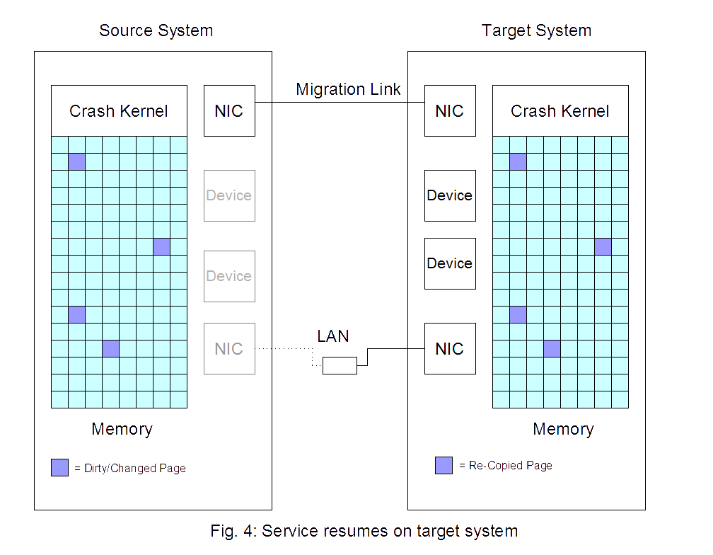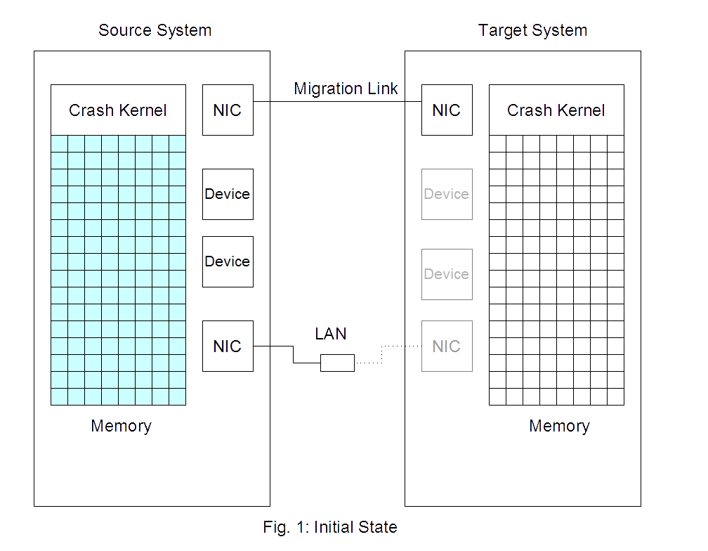 Once the target system is ready, the migrationer application is run on the source system to begin the migration. The migrationer loads up the appropriate kernel support module and invokes it to communicate with the target. One of the first things it does is copy all of memory (other than the reserved crashkernel space) over to the target system. Here's what it looks like after this copy is complete: